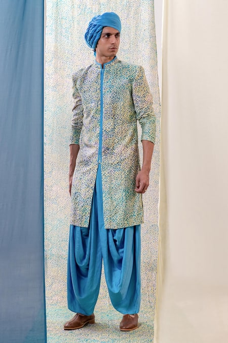 Blue and yellow kurta featuring a geometric print design