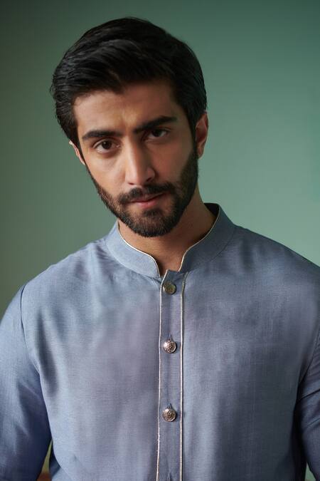 Blue kurta featuring full sleeves, mandarin collar, and silver pipe work