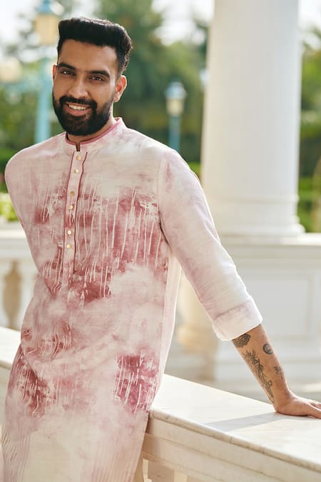 Salmon pink kurta featuring a mandarin collar and full sleeves with an all-over off-white abstract print