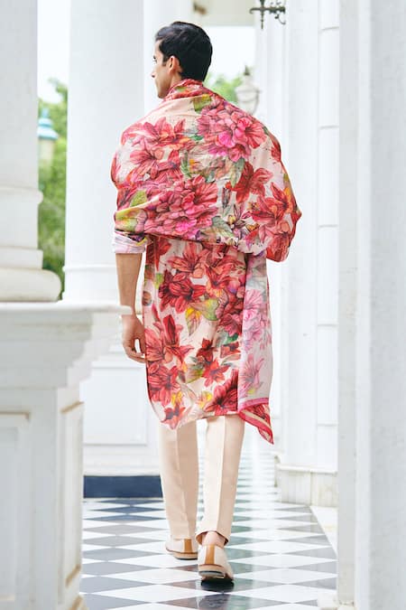 Bright pink kurta featuring a collar neckline, all-over floral print, and full sleeves