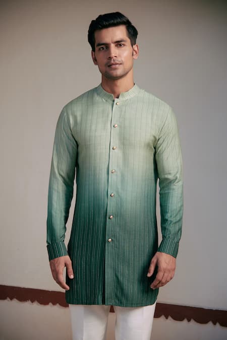 Green ombre kurta in a cotton silk base with zari stitchlines all-over and band collared neckline.