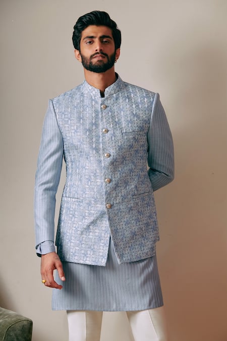 Blue bandhgala with pinwheel embroidery & mandarin collared neckline.