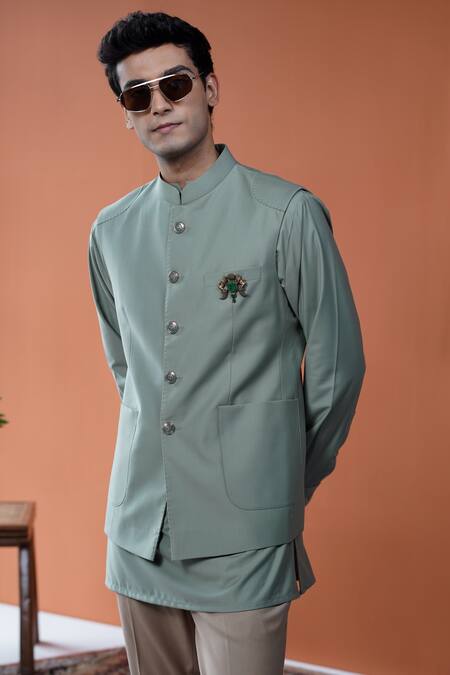 A sage green Bundi crafted from 100% perennial wool, featuring fine pick-stitched panels and a band collar. It is paired with a classic sage green kurta.