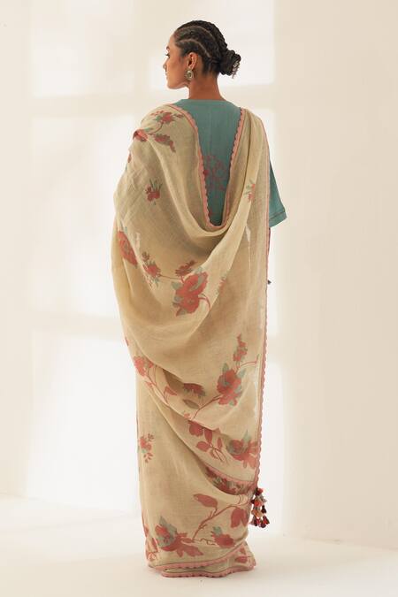 Beige floral printed pure linen handloom saree featuring a scalloped hem and tassel edged palla. Comes with an unstitched blouse piece in a contrasting color.