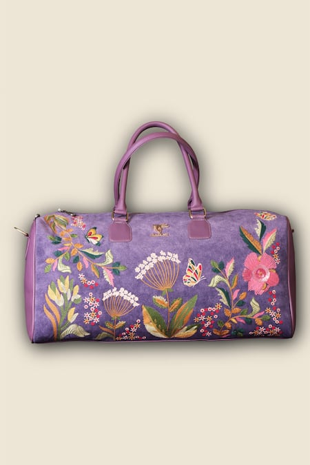 Purple duffel bag featuring embroidery on suede velvet finish.