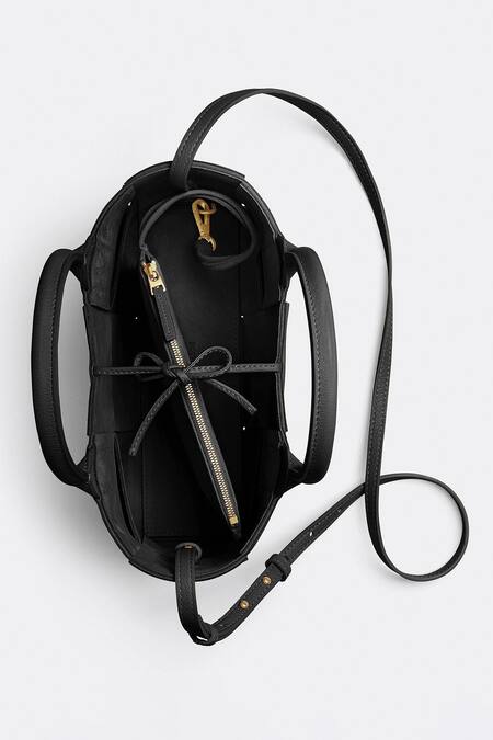 Black mini tote bag crafted from pure leather featuring an intricate checkered woven pattern