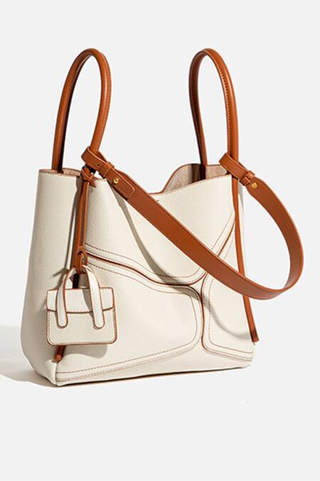 White tote bag made from vegan leather featuring a textured pattern and round handles