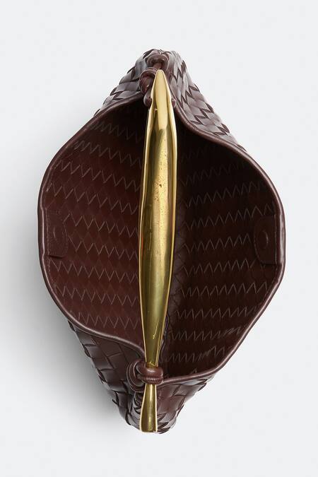 Brown leather handbag featuring a basket weave pattern and a sculptural metallic top handle