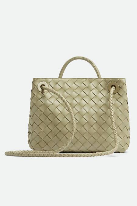 Olive handbag featuring intrecciato woven motifs and a shimmer brass finish infinity loop