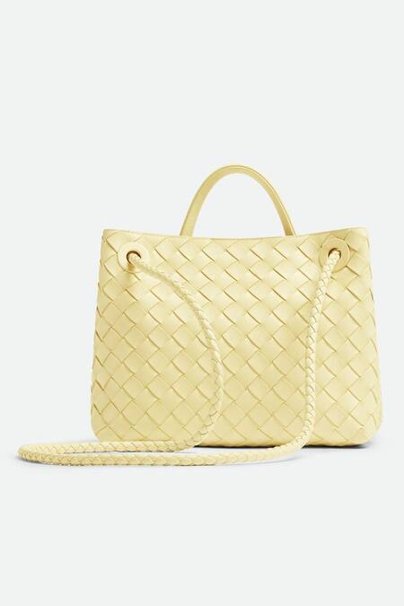 Off white handbag featuring intrecciato woven motifs and a shimmer brass finish infinity loop