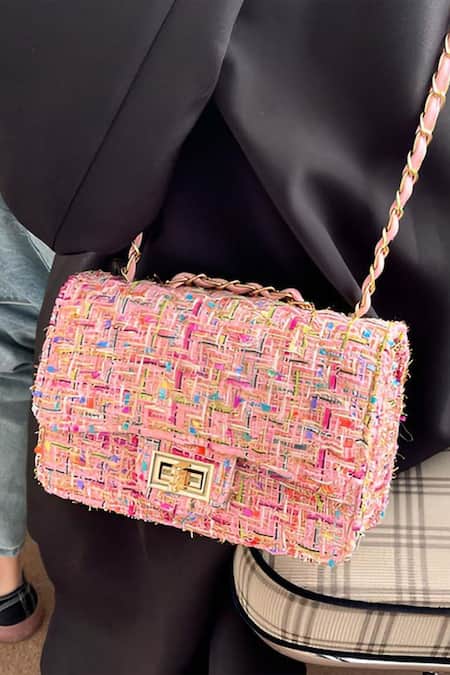 Pink handbag featuring thread embroidery in a geometric pattern