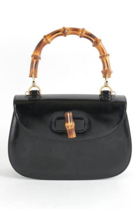 Black handbag featuring a structured shape with an envelope flap and bamboo hand-carved top handle
