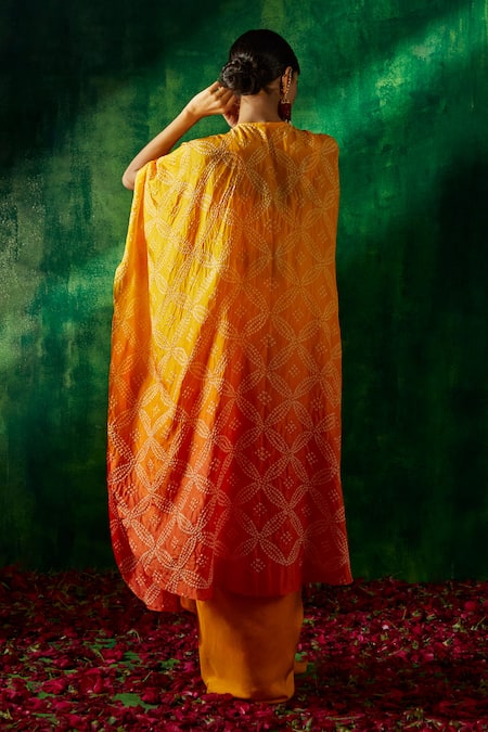 Yellowish orange ombre silk cape featuring bandhani print with shells and tassels embroidery. Paired with a draped skirt and a crop top with a square neckline.