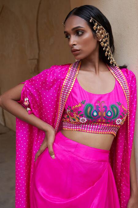 Hot pink cape featuring slit sleeves and all over bandhani pattern. Paired with a peacock embroidered blouse and a plain draped skirt.