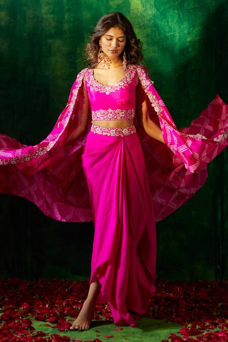 Hot pink silk cape featuring bandhani print with thread and mirror hand embroidery. Paired with a draped skirt and a sleeveless crop top.