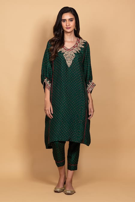 Green kaftan-style tunic with all-over bandhani print, embroidered V-neckline and cuffed sleeves. Comes with pant.