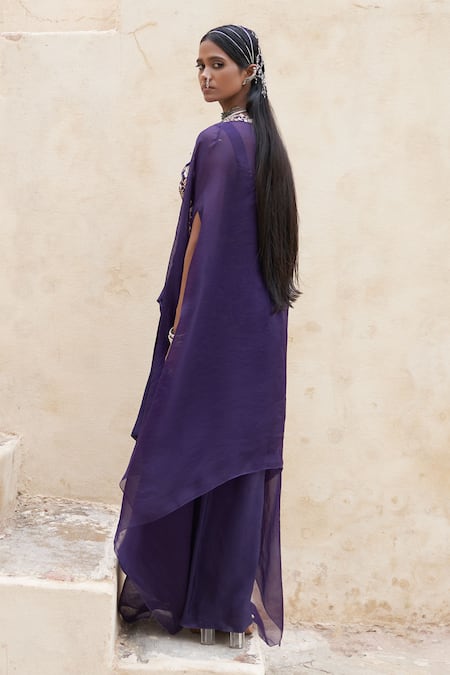 Purple Silk Embroidery Round Neck Blossom Cape And Draped Pick Up Skirt Set