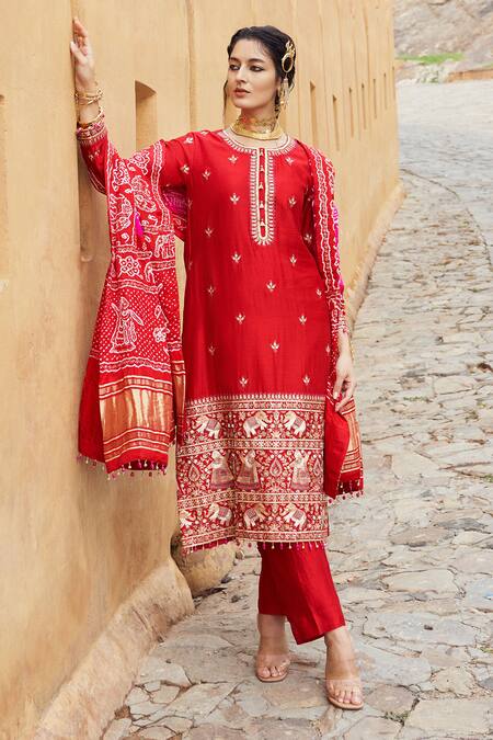 Red kurta featuring traditional motif embroidery and an attached tassel at the hem. Paired with a plain straight pant and a dupatta adorned with bandhani print and tassel details.