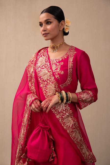 Hot pink silk chanderi anarkali featuring zari and gota hand embroidery. Paired with a straight pant, an organza dupatta, and a potli.