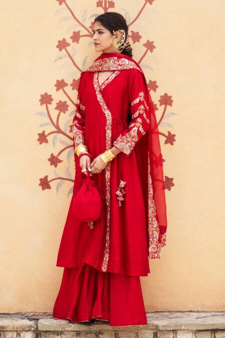 Red angarkha featuring paisley thread and pearls embroidery. Paired with a coordinating cutwork edged dupatta and solid sharara.