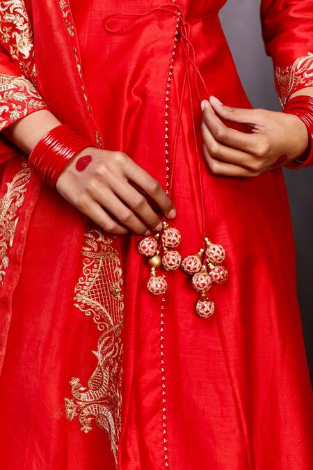 Red angarkha kurta with placement hand embroidered zari peacock motifs & side tie-up. Comes with pants & organza dupatta.