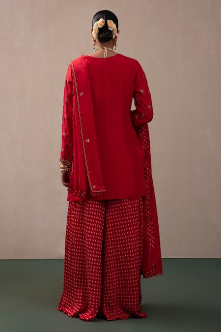 Red silk chanderi kurta featuring all-over lotus motif pattern and contrast resham, zari, and sequin embroidery. Paired with flared sharara with all-over bandhani pattern and embroidered dupatta with scalloped cut work hem.