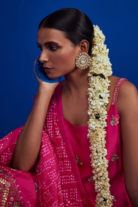 Hot pink silk chanderi kurta with floral embroidery. Paired with pant & printed dupatta.