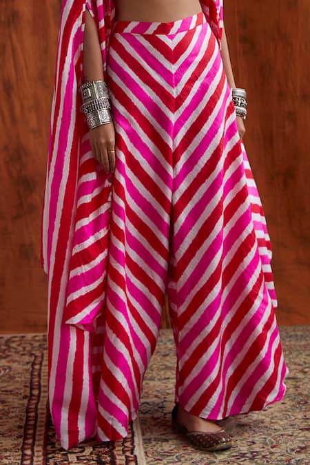 Hot pink-red cape with all-over leheriya print, embroidered neckline and asymmetric hem. Comes with crop top, gharara and potli bag.