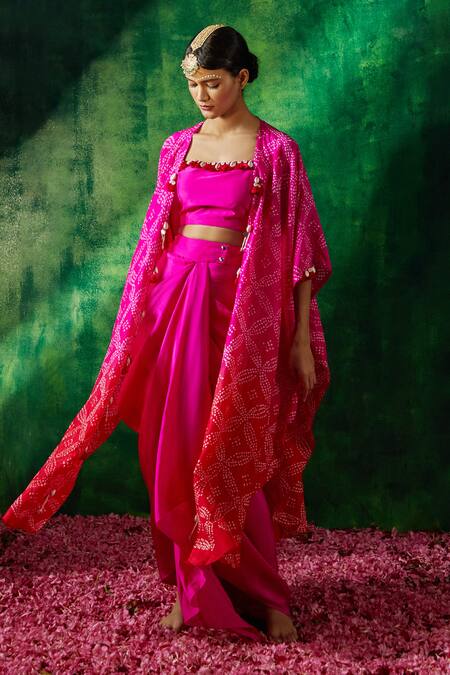 Rani and red ombre silk cape featuring bandhani print with shells and tassels embroidery. Paired with a draped skirt and a sleeveless crop top.