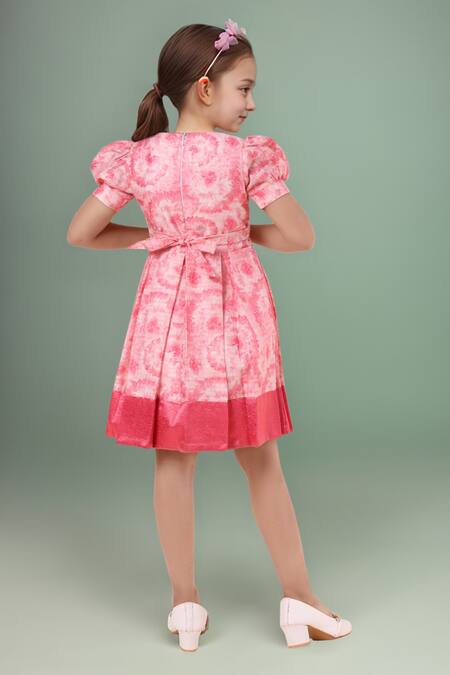 Pink printed dress featuring puff sleeves and a belted waist with floral embellishments