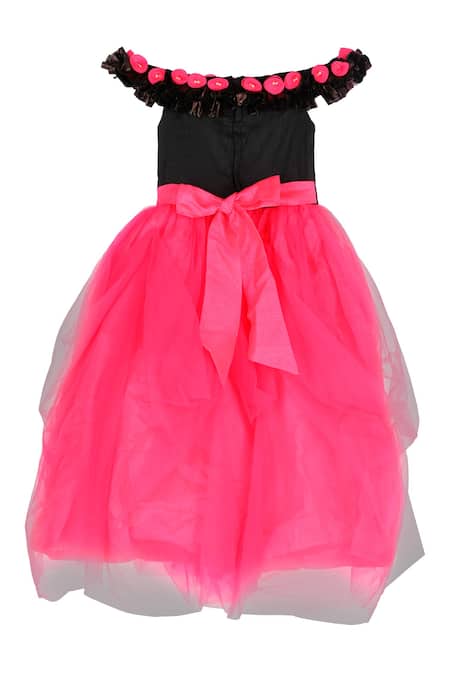 Black and pink off shoulder gown featuring floral applique motifs and a velvet bodice. The gown comes with a tie-up bow at the back and is crafted from raw silk, net, and velvet.