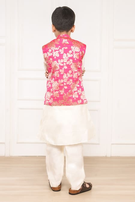 Pink brocade button down bundi jacket featuring a floral pattern. Paired with a cream kurta and pyjama.