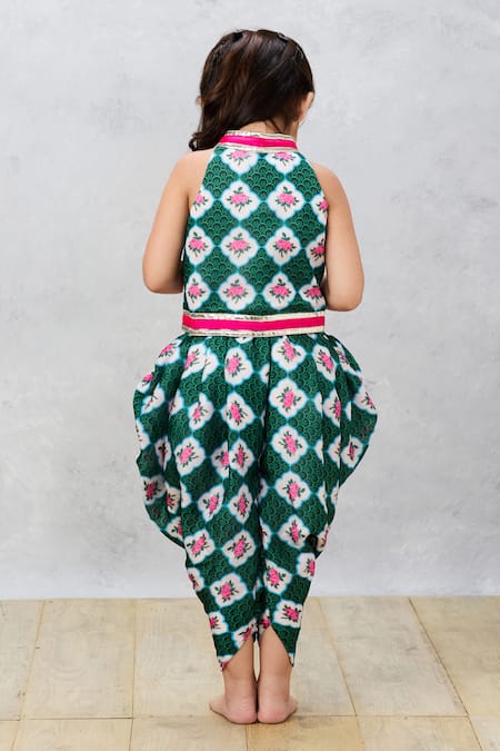 Green floral print top featuring a band collar and sleeveless design. Paired with coordinating dhoti pant and attached buttercrepe lining.