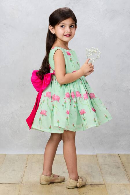 Green Chanderi Bows Lotus Print Dress
