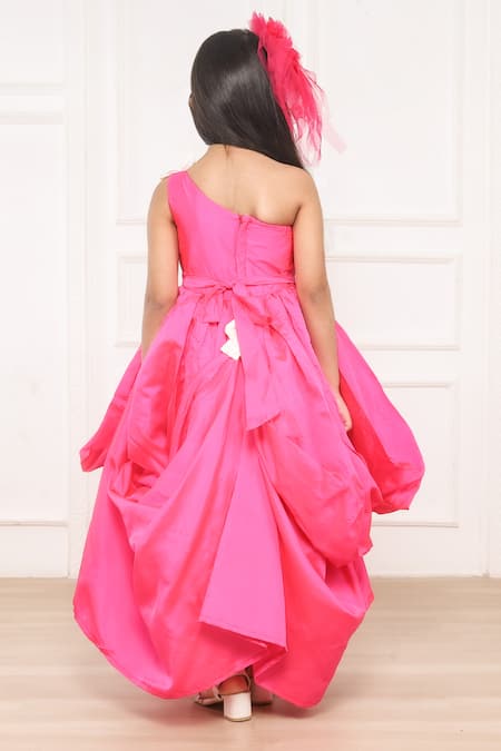 Pink one-shoulder gown featuring pin tuck detail and pearl embellishments on the yoke
