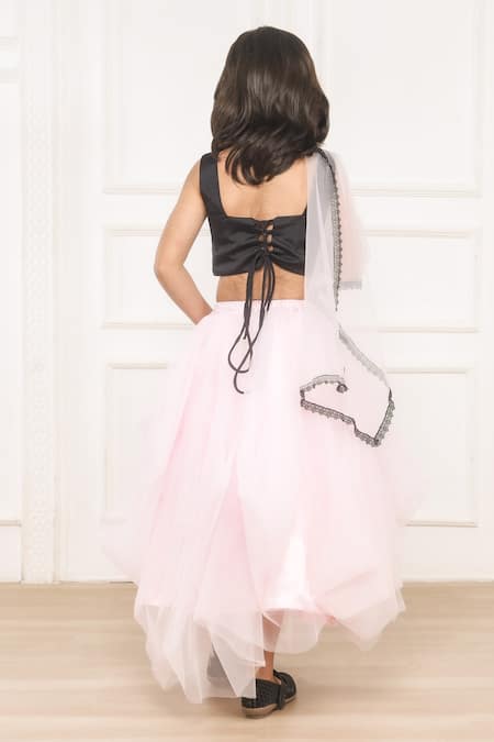 Baby pink tulle lehenga featuring satin flower embellishments and net roaching. Paired with a sequin embellished blouse and a laced border dupatta.