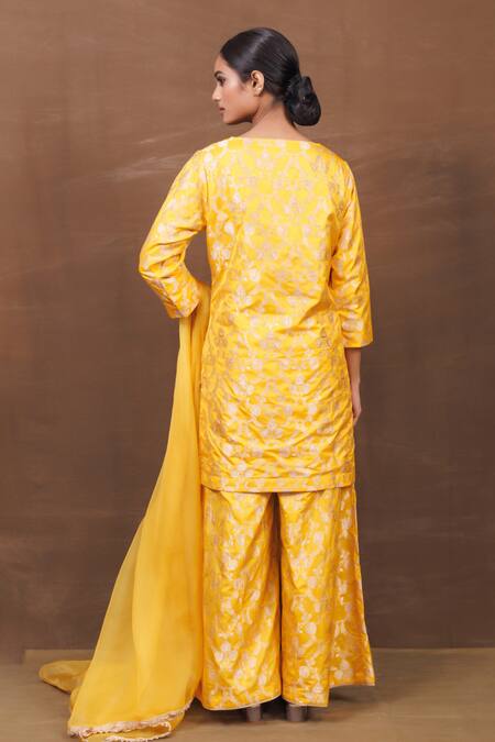 Yellow Silk, Chiffon Embroidery V-neck Banarasi Kurta Sharara Set