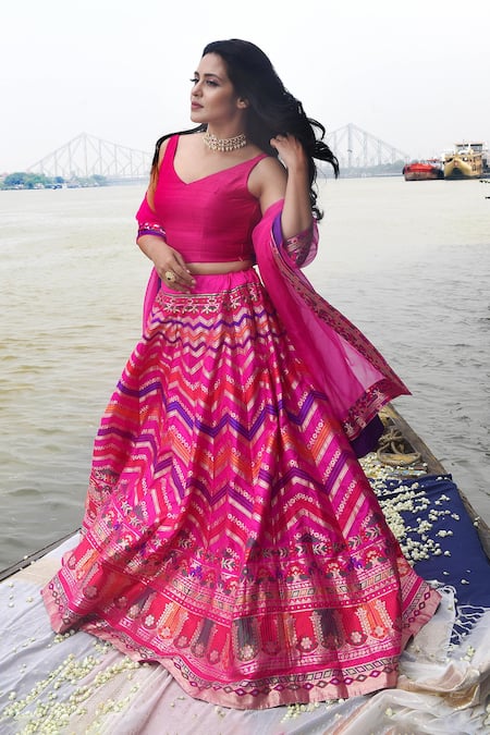 Pink lehenga featuring woven zari chevron patterns on kalis and floral jaal border. Accompanied by a dupatta and unstitched blouse fabric.
