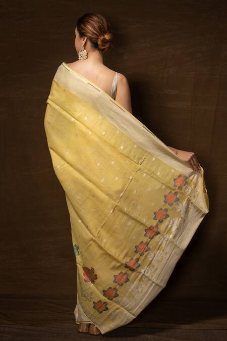 Yellow banarasi saree in Muga silk featuring handwoven floral kalamkari patterns. Paired with a running blouse.