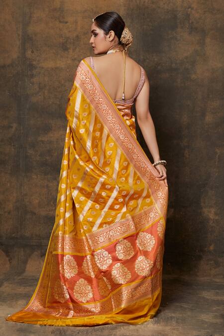 Yellow banarasi pure silk saree featuring handwoven leaf and stripe motifs. Comes with a running blouse piece for a complete look.