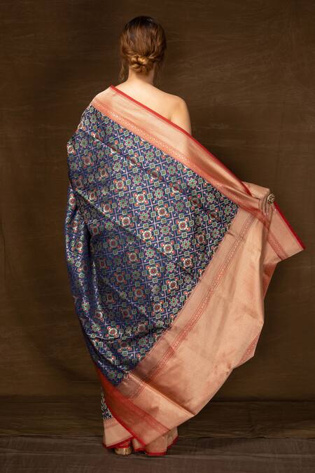 Blue silk patola saree featuring all-over woven geometric and floral motifs. Comes with a running blouse piece.