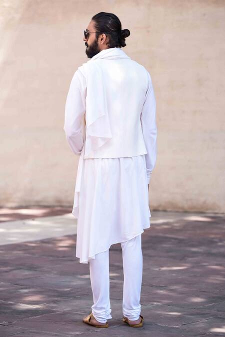 Ivory bundi with inverted pintucks & welt pockets. Paired with asymmetric kurta, churidar & diagonal-cut stole.