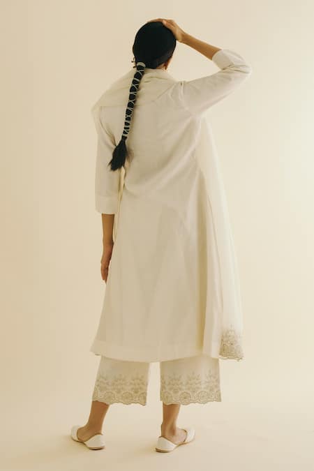 Ivory silk chanderi pintuck kurta. Paired with embroidered palazzo and dupatta.