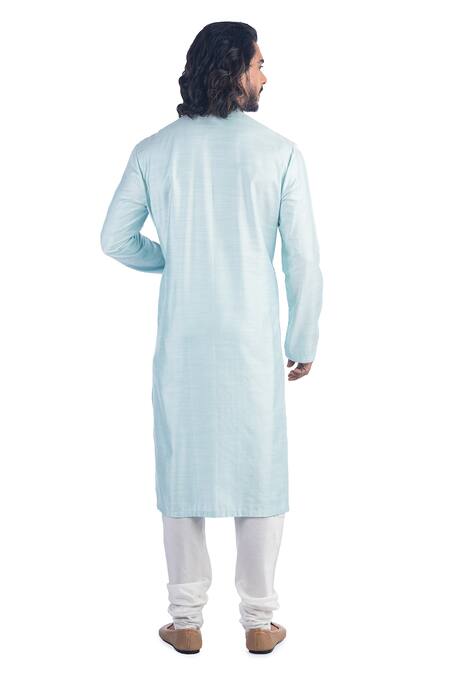 Aqua kurta with floral embroidered placket & pintuck texture in front. Paired with off-white churidar.