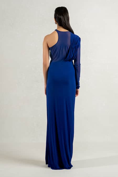 Blue Maheshwari, Lycra Round Neck Hand Pleated Sheer Draped Gown