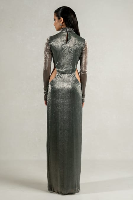 Green Lycra High Neck Metallic Side Moon Cut Gown