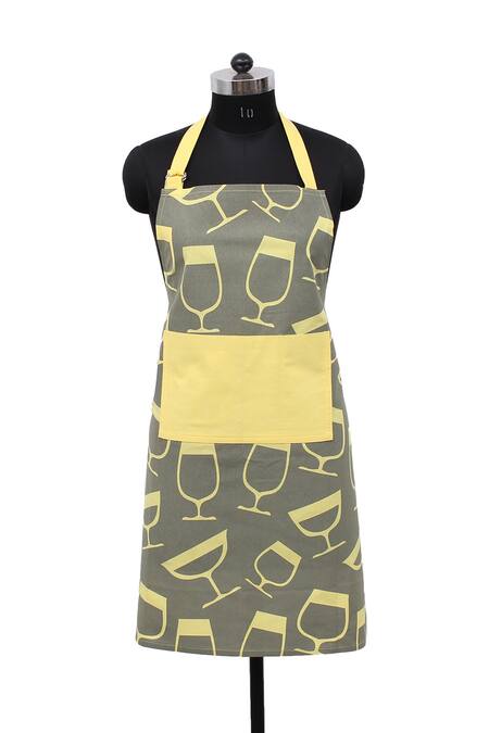 Grey apron in cotton with glass print & back tie-ups. Comes with pair of printed gloves & a pot holder.