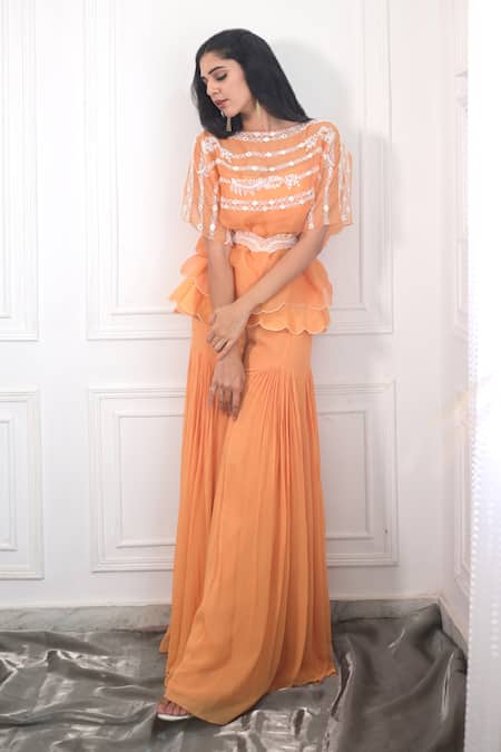 Turmeric yellow hand embroidered sharara set featuring a round neckline and half sleeves top. Paired with an inner top and a gathered godet sharara, this set is adorned with glass beads, pearls, and sequins.