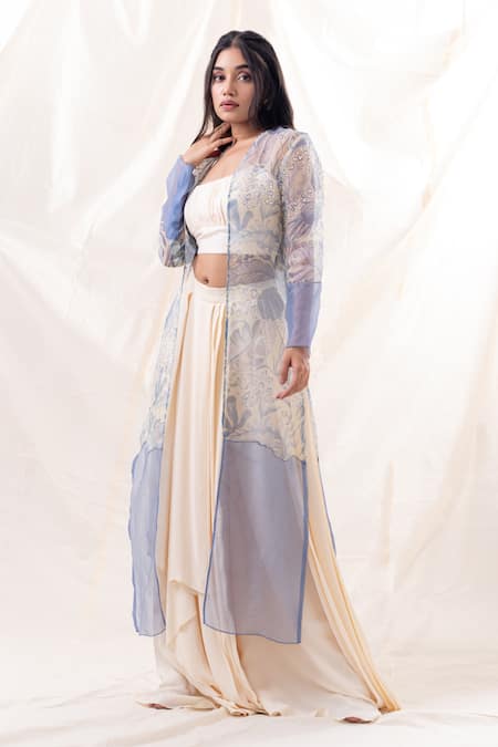 Ocean blue jacket featuring floral print with sequins and pearls embroidery. Paired with an ivory draped pant and a gathered crop top.
