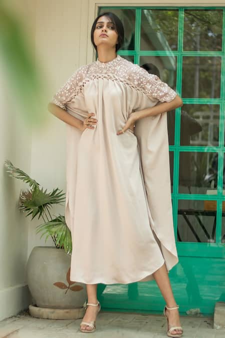Beige tunic featuring high neck, half sleeves, and hand embroidered details